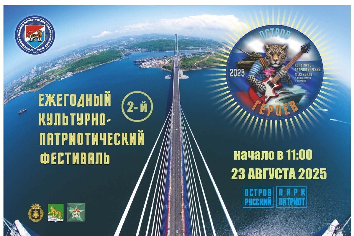 23 августа во Владивостоке на территории парка "Патриот" и мемориального комплекса "Ворошиловская батарея" (о. Русский) состоится второй культурно-патриотический фестиваль "Остров Героев", сообщает официальный телеграм-канал администрации Владивостока.