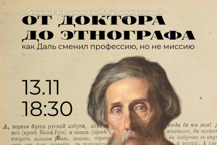 В понедельник, 13 ноября, в 18:30 библиотека им. А.С. Пушкина (ул. Светланская, 55) приглашает на лекцию «От доктора до этнографа». Вы узнаете, как Владимир Даль, морской офицер и врач, стал «Казаком Луганским» и создал главную энциклопедию народной жизни. Лектор Мария Кожевникова раскроет секрет его необычной дружбы с Пушкиным и расскажет, как служба на флоте помогла ему услышать язык всей империи.