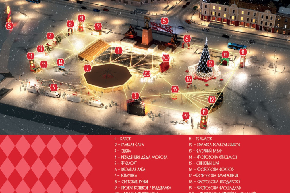 Организаторы пояснили, что символ года — Красный Конь — воплотит для детей образ любимой игрушки, а для взрослых станет олицетворением энергии города, устремленного в будущее. Площадку украсит 20-метровая ель, разнообразные фотозоны, в том числе вязаная, каток с теплушкой, ярмарка ремесленников, фудкорт и резиденция Деда Мороза.