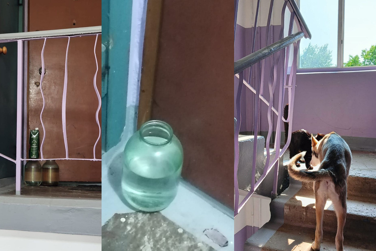Ситуация усугубилась, когда молодые люди завели животных. Собака и два котенка остались буквально брошенными на произвол судьбы. Хозяева целыми днями отсутствуют, а дверь в квартиру закрывают... трехлитровой банкой.