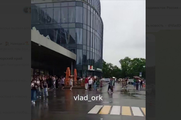 Во Владивостоке проходит срочная эвакуация торгового центра «Седанка Сити». По словам очевидцев, людей — посетителей и сотрудников — вывели на улицу, где они укрываются от дождя под карнизом здания.