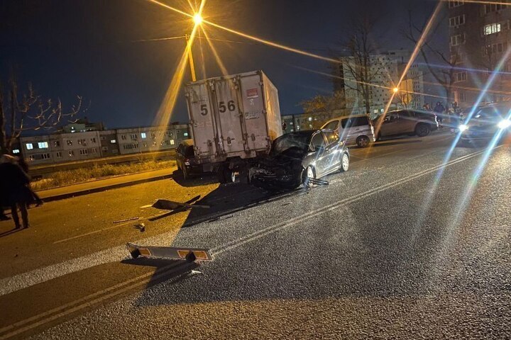 Водитель автомобиля Toyota Vitz попыталась скрыться от преследования, в результате чего не справилась с управлением и совершила столкновение с тремя припаркованными автомобилями.