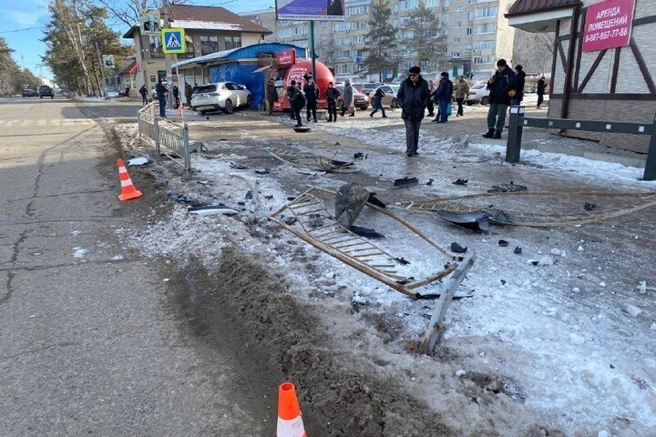 Предварительные данные указывают на то, что водитель автомобиля Toyota Harrier, двигаясь по улице Калининской, столкнулся с дорожным ограждением, после чего автомобиль съехал с проезжей части и врезался в павильон, расположенный на остановке общественного транспорта.