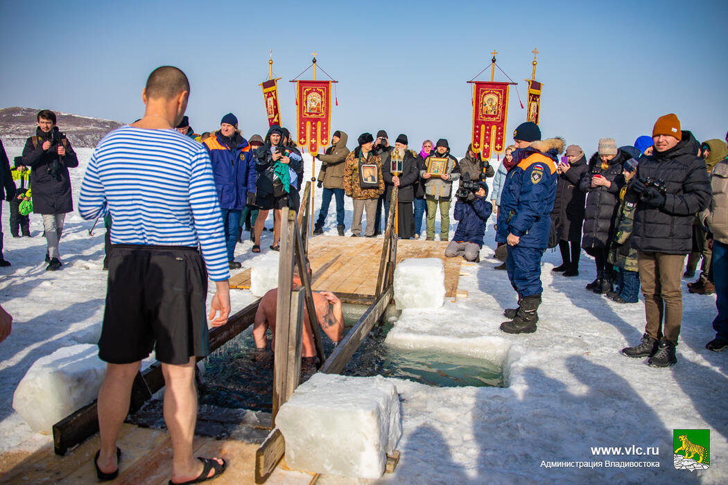 Желающих прыгнуть в купель сегодня не мало. Многие приморчане прихватив полотенце, сланцы и купальники поспешили на остров Русский. Там для ныряльщиков, свято верящих, что вода даст им силы и новую жизнь, собрались десятки.