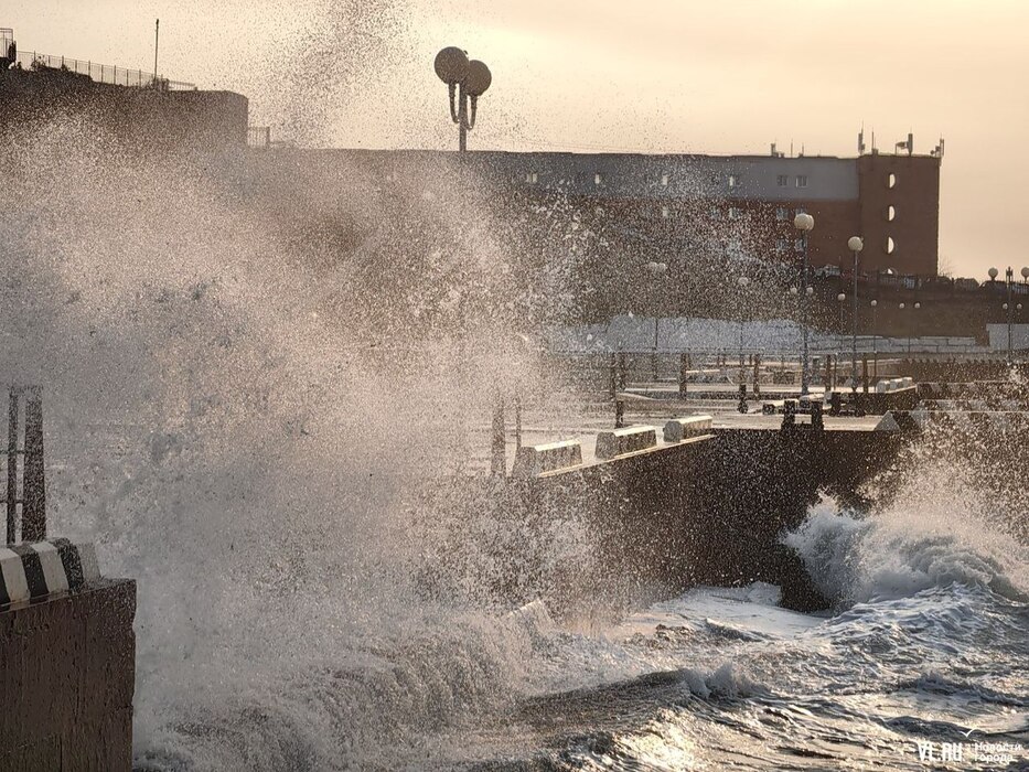 Разгул стихии: перед снежным ударом море штурмует станцию ТОФ во Владивостоке