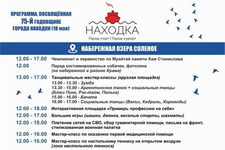 Жителей Приморского края приглашают на мероприятия с насыщенной программой в честь 75-летнего юбилея со дня образования Находки. На протяжении 18 мая на набережной озера Соленое и площадке спортшколы «Приморец» организуют активности, театрализованный концерт, кавер-выступление и салют, сообщает пресс-служба администрации города.