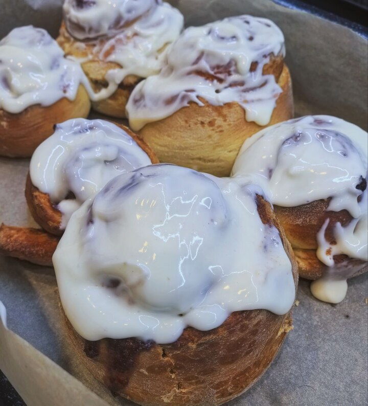 Достаньте румяные синабоны из духовки, дайте им немного остыть и пока они еще теплые, щедро покройте их сырным кремом.