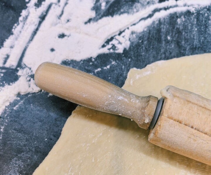 Обомните подошедшее тесто и раскатайте на припыленной мукой поверхности в большой прямоугольник толщиной около 5 мм.