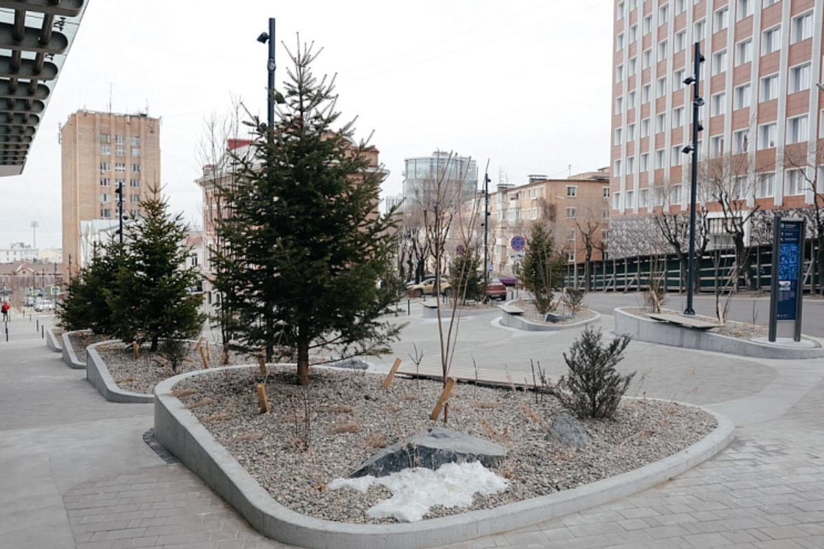 Преображать территорию начали еще весной, когда проложили пешеходные зоны, соединенные с Океанским проспектом и улицей Алеутской, высадили кустарники, деревья, многолетние цветы и травы. За время ремонта также заменили все коммуникации: сети водоснабжения, канализации, теплотрассы, электролинии и магистрали связи.