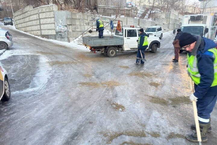 Для борьбы с обледенением после снега с дождём дорожные службы Владивостока за ночь обработали реагентами 26 тысяч квадратных метров тротуаров, сообщает Официальный телеграм-канал администрации Владивостока.
